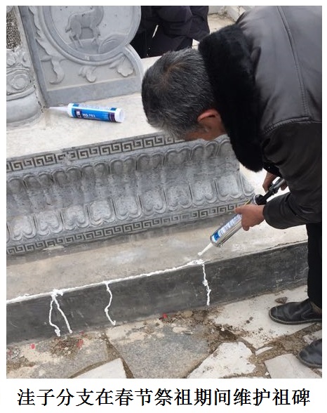 2019年1月30日(农历腊月二十五日) 洼子分支宗亲代表23世传浦,24世克业、克茂、元康、成忠、成信、成茂、志文、成全、成伟,25世振民、振星、孔训、华训、仕安、迎训,26世永会等去障保峪祖茔上坟祭祖并维护了始祖碑基座。