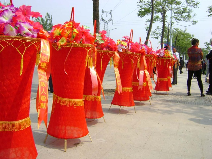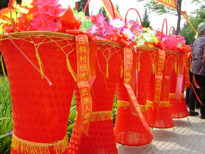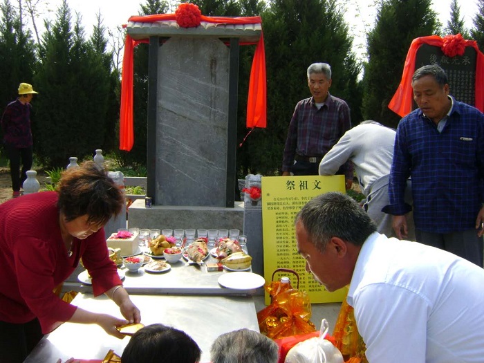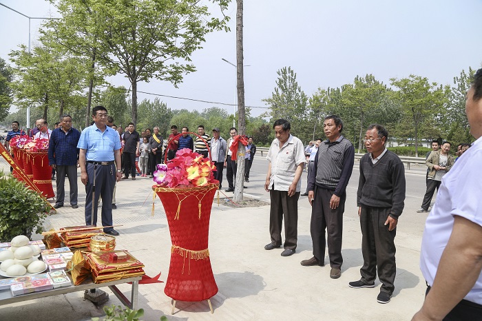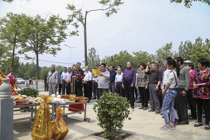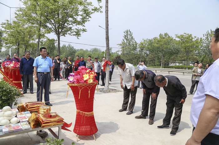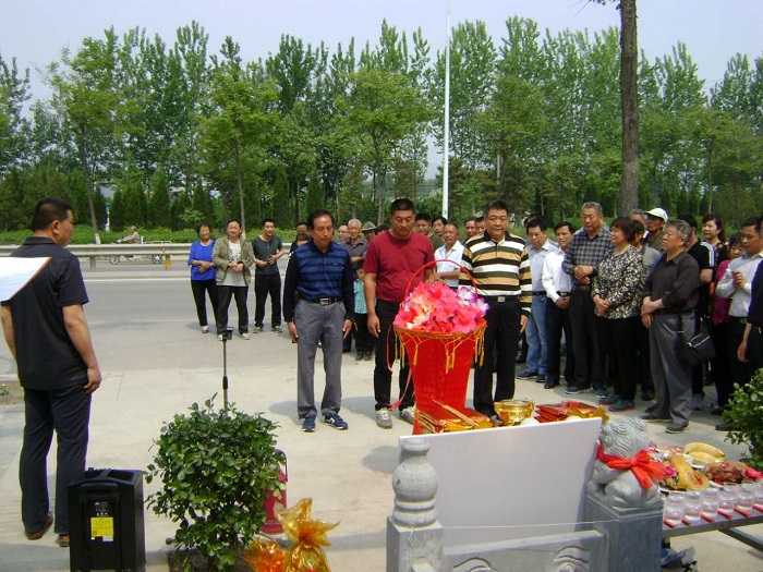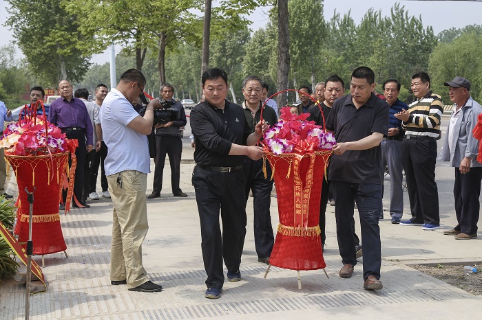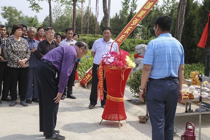 涝洼老家族人代表张传法、传友、传亭、成仁、成信、成欣向谱碑敬献花篮