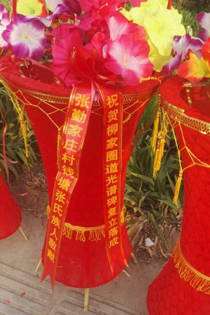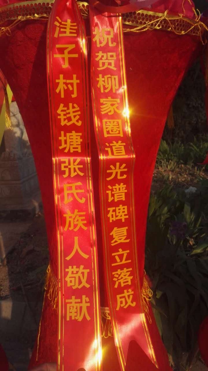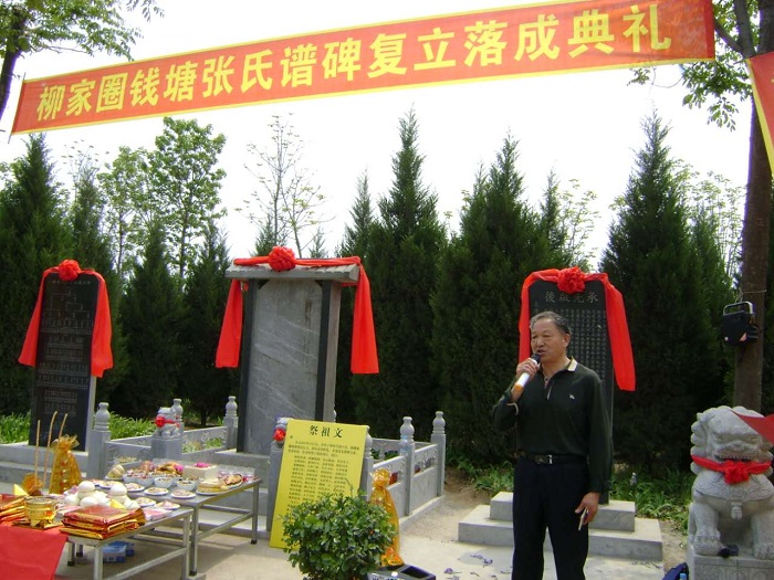 2017年5月1日,临朐大地春光明媚,百花盛开。柳家圈钱塘张氏族人,钱塘张氏老家涝洼村族人代表,明朝都堂御史张邦彦后裔黄崖头村族人代表,柳家圈始迁祖梦熊公之四弟梦圣公后裔洼子村、张勤家庄村族人代表,从柳家圈迁出村平安庄、庄科、文泉族人代表,齐聚复立道光谱碑前,隆重举行柳家圈钱塘张氏谱碑复立落成庆典。上午10时18分,庆典准时开始。