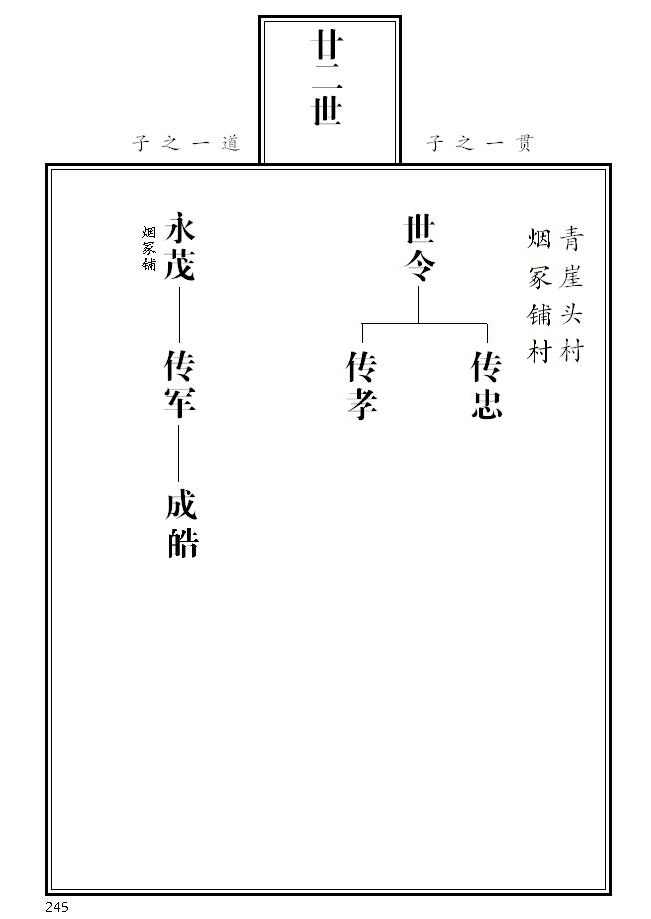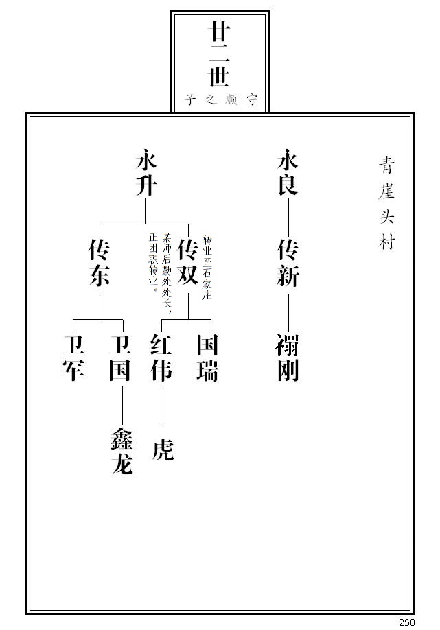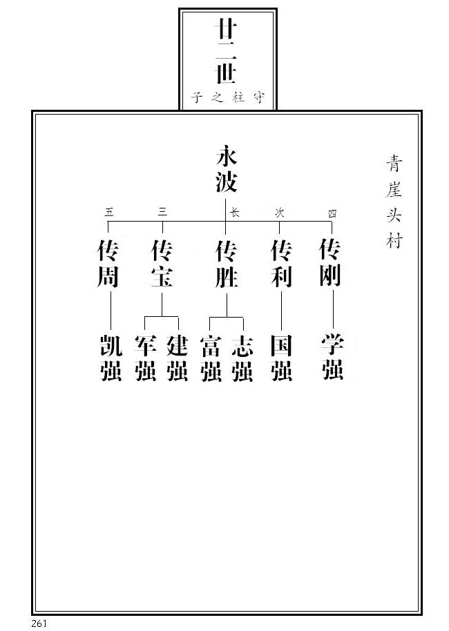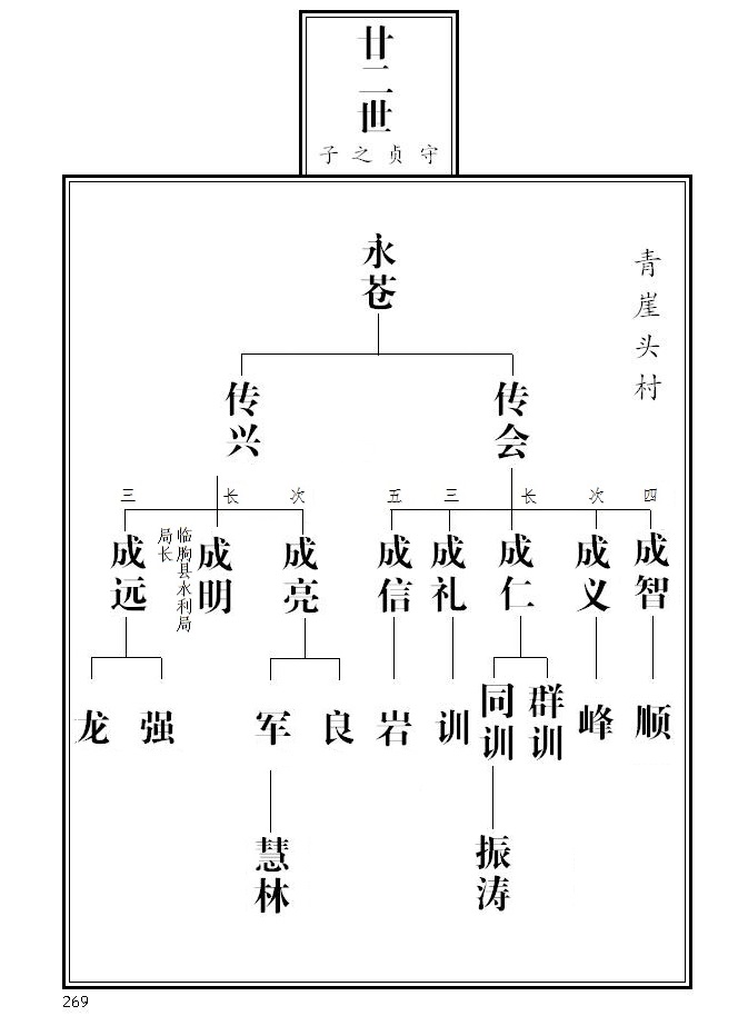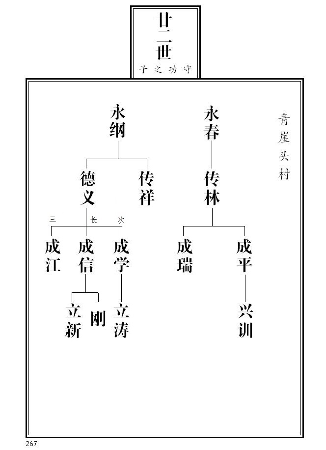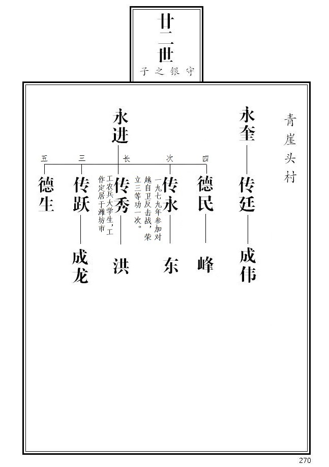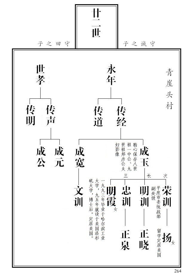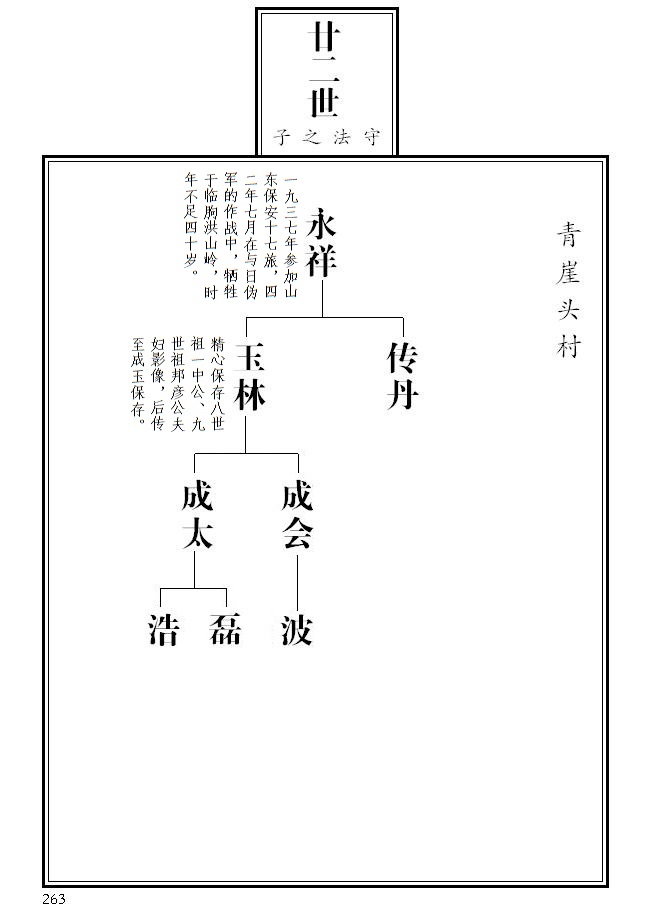 20、 第265页,永庆名侧加注迁辽宁本溪、其子之后失考;永茂名侧加注参与一九五五年续谱工作;根据临朐县档案局《革命烈士名录》,传义名侧标注革命烈士并加注简介;传聚、传顺名侧加注;成富更正为成福。