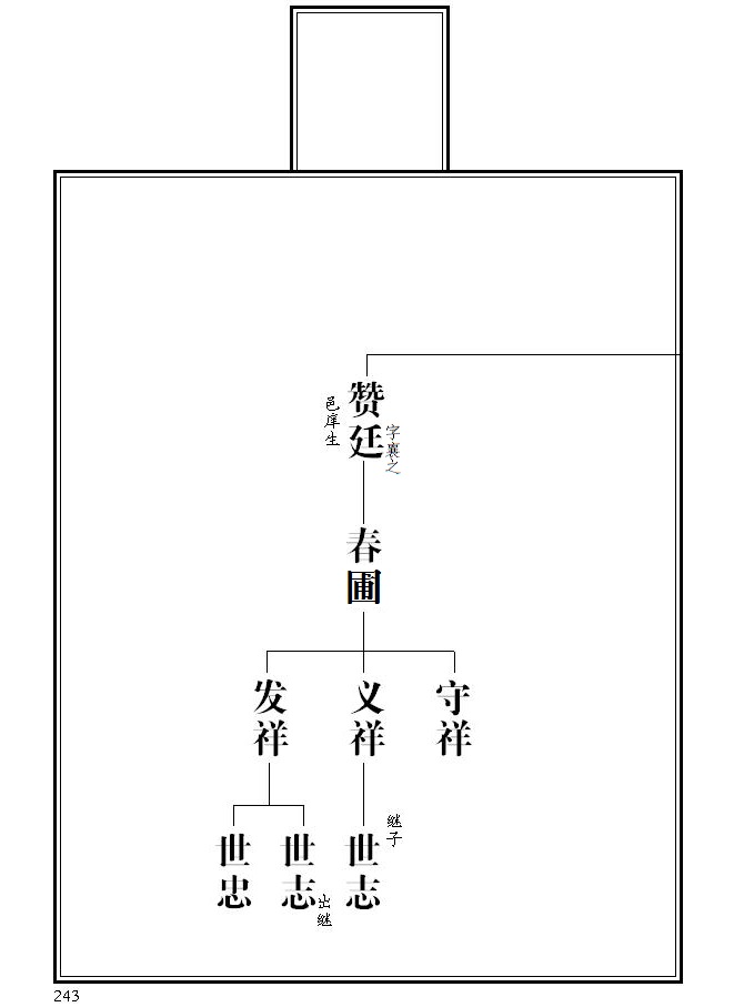 12、 第243页,根据宣统版《张氏族谱》,赞廷名侧加注字襄之;春图更正为春圃。