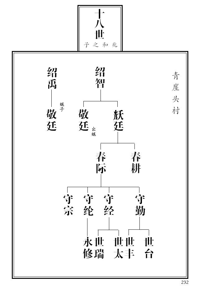 6、 第231页,根据宣统版《张氏族谱》,辅廷名侧标注太学生;为便于外迁族人追本溯源,绍勤(迁邢家庄)名下补录子孙两代。