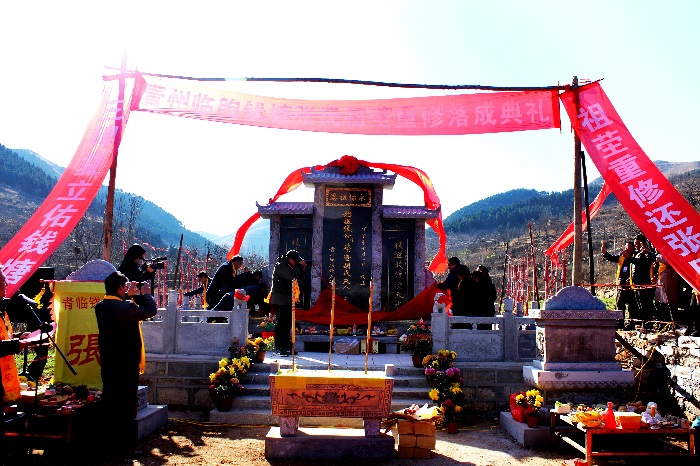 始祖荣公字华斋,元朝拔贡,青州同知,一身正气,政声斐然,致仕落籍三郎山,立村名曰张家庄。只因衡王选宝地,东徙数里涝洼乡。有道是,南有桐城六尺巷;谁曾知,钱塘张家迁村庄。青州临朐互变化,涝洼永居逄山旁。天上众星拱北辰,钱塘张氏望故乡。